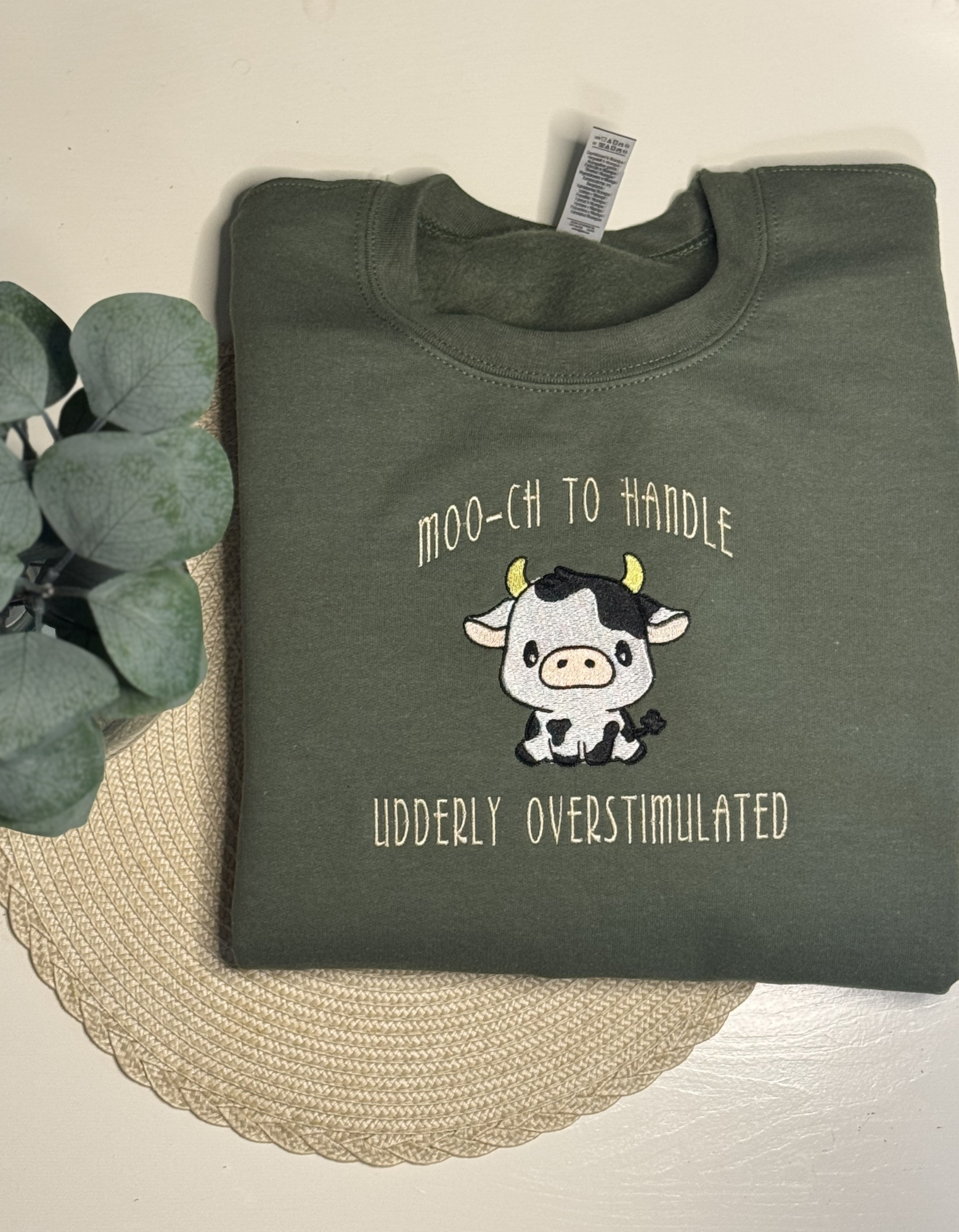 "Moo-ch to Handle, Udderly Overstimulated" Embroidered Cow Sweatshirt: A Fun and Cozy Statement Piece